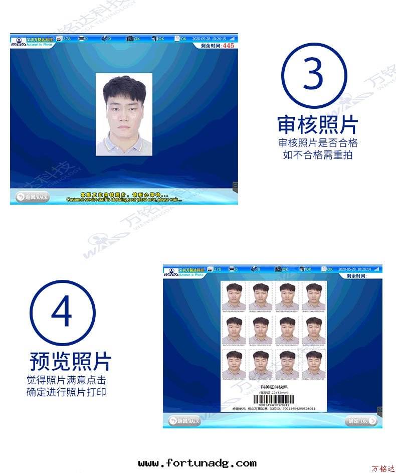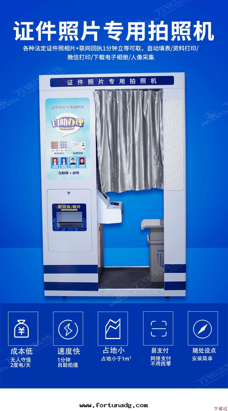 拍照、照片處(chù)理(lǐ)、质量(liàng)檢測、高(gāo)度智能(néng)化(huà)、高(gāo)质量(liàng)控制、方(fāng)便快捷、二(èr)十(shí)四小时(shí)無人(rén)值守、支持(chí)微信(xìn)、支付寶(bǎo)、银(yín)聯等支付、後(hòu)台(tái)有(yǒu)多(duō)个(gè)模版供打(dǎ)印